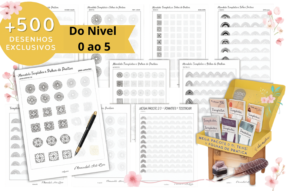 Além disso, o pacote inclui mais de 500 desenhos exclusivos, folhas de prática guiadas e à mão livre, e 9 bônus incríveis — como diários, planners, pôsteres e até uma playlist relaxante. 🎶